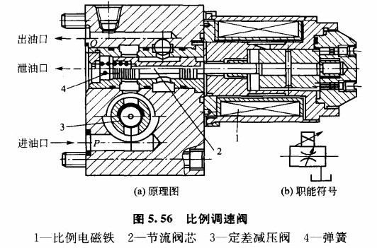 圖5.56所示為比例調(diào)速閥的結(jié)構(gòu)原理圖。與普通調(diào)速閥相比,其主要區(qū)別是用直流比例電磁鐵取代了手柄對節(jié)流閥的控制。比例電磁鐵1的輸出力作用在節(jié)流閥芯2上,與彈簧力、液動力、摩擦力相平衡,對應(yīng)一定的控制電流,對應(yīng)一定的節(jié)流開度。通過改變輸入電流的大小,即可改變通過調(diào)速閥的流量。