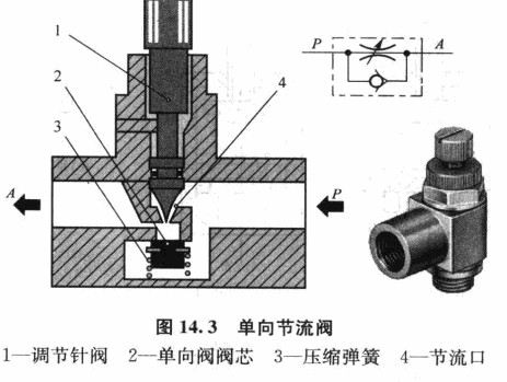 排氣節(jié)流閥是裝在執(zhí)行元件的排氣口處,通過調(diào)節(jié)排入大氣的流量,以改變執(zhí)行元件的運(yùn)動(dòng)速度的一種控制閥。它常帶有消聲器件,以降低排氣噪聲,并能防止外部環(huán)境通過排氣孔污染氣路中的元件。圖14.4所示是排氣節(jié)流閥的工作原理圖。