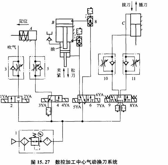 圖15. 27所示為某油壓沖床氣動(dòng)換刀系統(tǒng)原理圖,該系統(tǒng)在換刀過程中實(shí)現(xiàn)主軸定位、主軸送刀、拔刀、向主軸錐孔吹氣和插刀動(dòng)作。