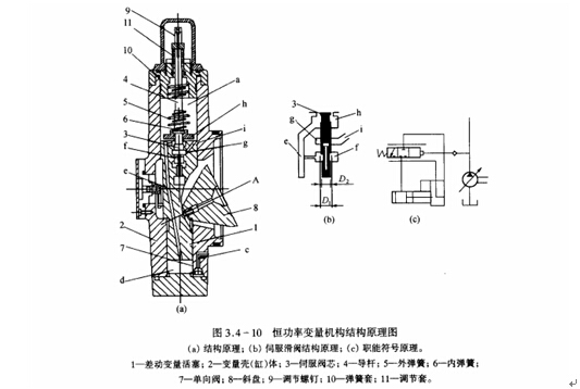 四柱油壓機(jī)恒功率變量機(jī)構(gòu)為液壓阪動(dòng)(伺服)變量機(jī)構(gòu)。又稱壓力補(bǔ)償變量機(jī)構(gòu),其機(jī)構(gòu)原理如圖3.4-10所示,其中伺服閥芯3與差動(dòng)變量活塞1掬成伺服滑倒。差動(dòng)變量活與變量殼(缸)體2掏成主牽動(dòng)液壓缸。