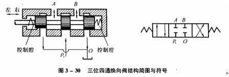 圖示為中位,四油口互不相通,如符號(hào)中的中間方塊所示;閥芯向左移動(dòng).P.→B.A→o.