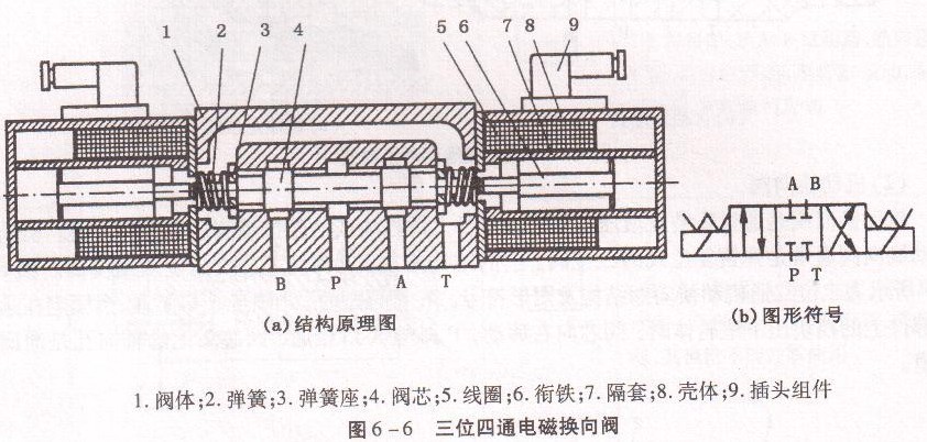 如圖6 -6(a)所示為三位四通電磁換向閥的結(jié)構(gòu)原理圖。閥的兩端各有一個電磁鐵和一個對中彈簧。閥芯在常態(tài)時處于中位。當(dāng)右端電磁鐵通電時,右銜鐵6通過推桿將閥芯4推至左端,閥右位工作,其油口P通B,A通T;當(dāng)左端電磁鐵通電時,閥芯移至右端,閥左位工作,油口P通A, B通T。圖6 -6(b)為三位四通電磁換向閥的圖形符號。