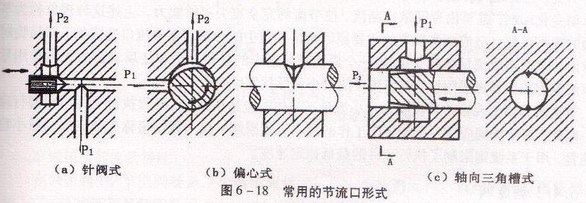 圖6 -18是常用的三種節(jié)流口形式。圖6 -18(a)為針閥式節(jié)流口,針閥做軸向移動(dòng),政主通流面積,以調(diào)節(jié)流量,其結(jié)構(gòu)簡(jiǎn)單,但流量穩(wěn)定性差,一般用于要求不高的場(chǎng)合。圖6-8(b)為偏心式節(jié)流口,閥芯上開(kāi)有截面為三角形或矩形的偏心槽,轉(zhuǎn)動(dòng)閥芯就可改變通流亙積以調(diào)節(jié)流量,其閥芯受徑向不平衡力,適用于壓力較低的場(chǎng)合。圖6-18(c)為軸向三角噎式節(jié)流口,閥芯端部開(kāi)有一個(gè)或兩個(gè)斜三角槽,在軸向移動(dòng)時(shí),閥芯就可改變通流面積的小,其結(jié)構(gòu)簡(jiǎn)單,可獲得較小的穩(wěn)定流量,應(yīng)用較廣泛。